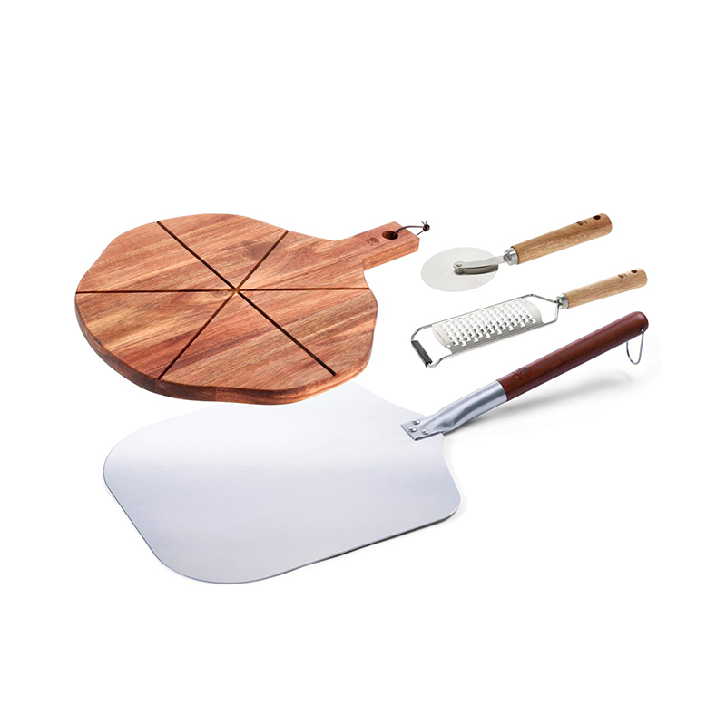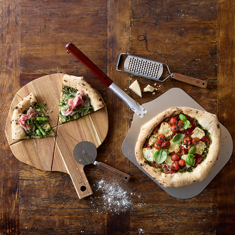 Mål: diameter 36 cm - Pizzaskærer og rivejern materiale: Stål og akacietræ