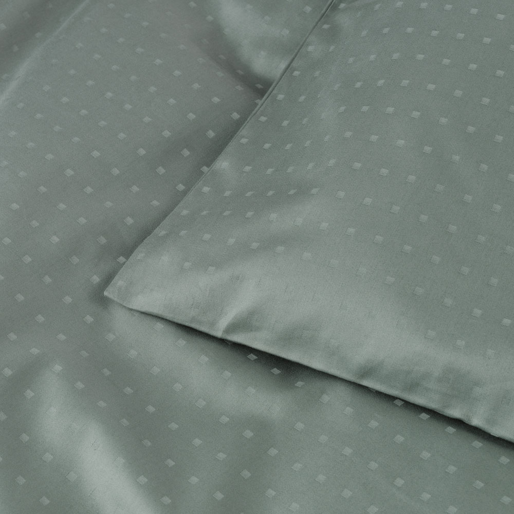 Det geometriske mønster af små kuber fremhæves smukt af den reflekterende satinvævning, der giver et let og harmonisk udtryk.